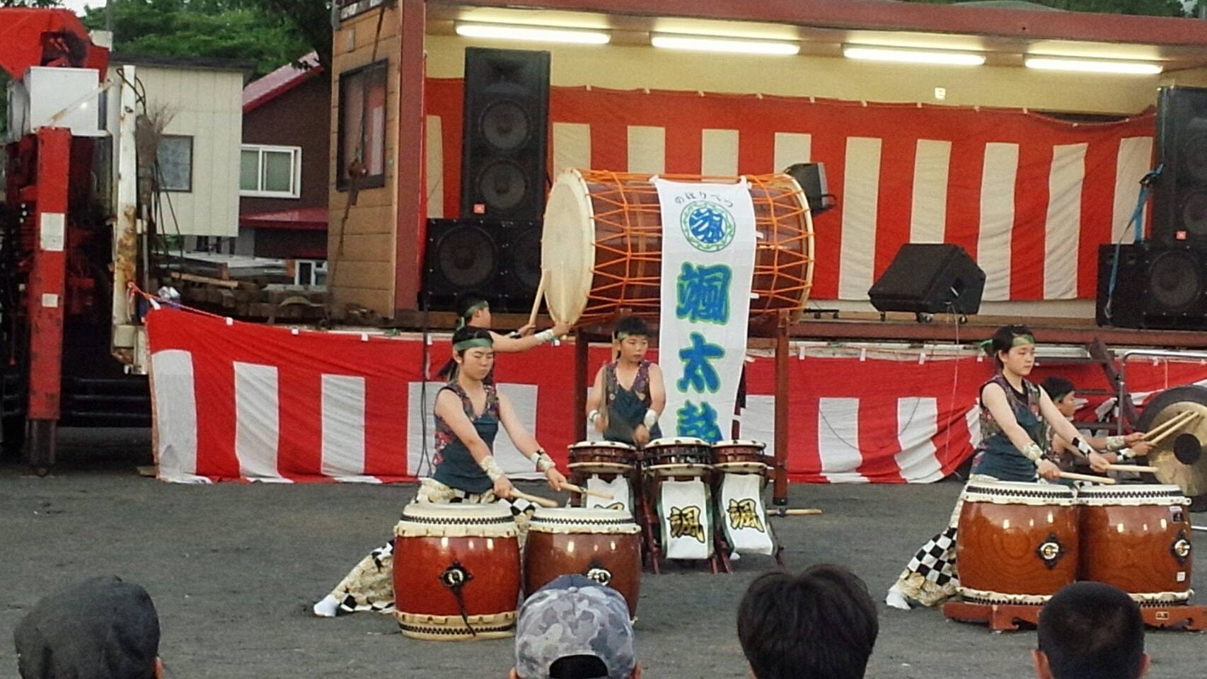 左 手前が 沙姫 中央 3つの太鼓を 叩いているのが 慎也です。