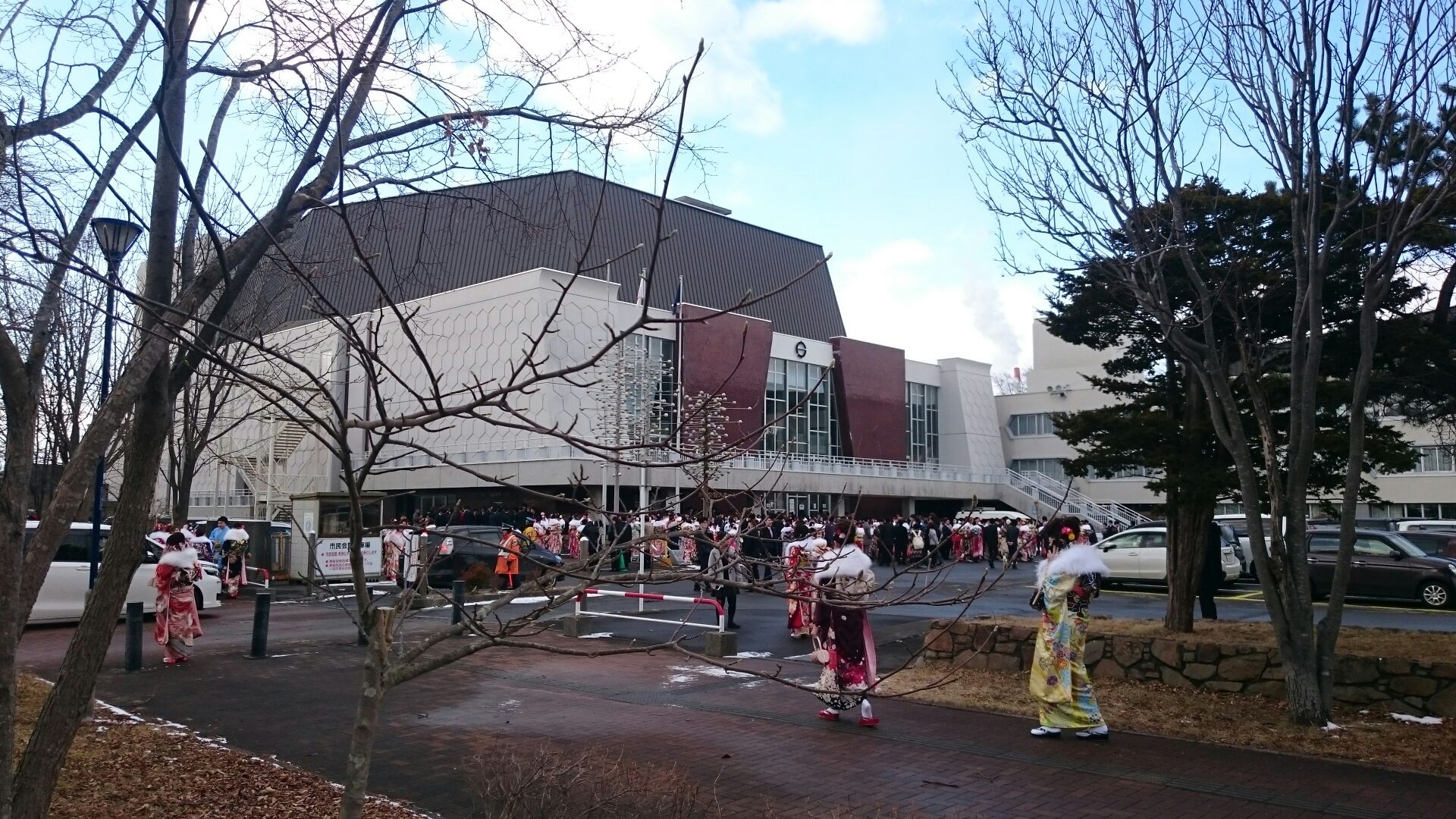 しぶい色合いの建物とぱっとしない空色に、新成人の衣装が色を添えて晴れやかにしてくれています。いいですね~。