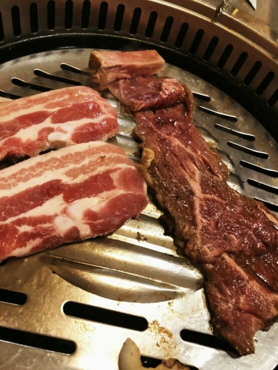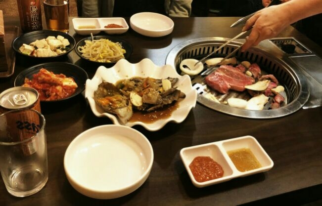 焼肉。店主が切り分けてくれるんですって。
