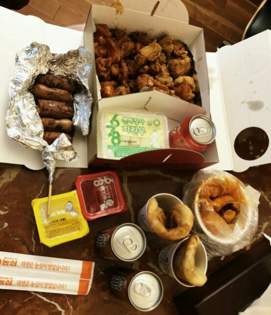 ジャンクフードのフライドチキンとホットク。