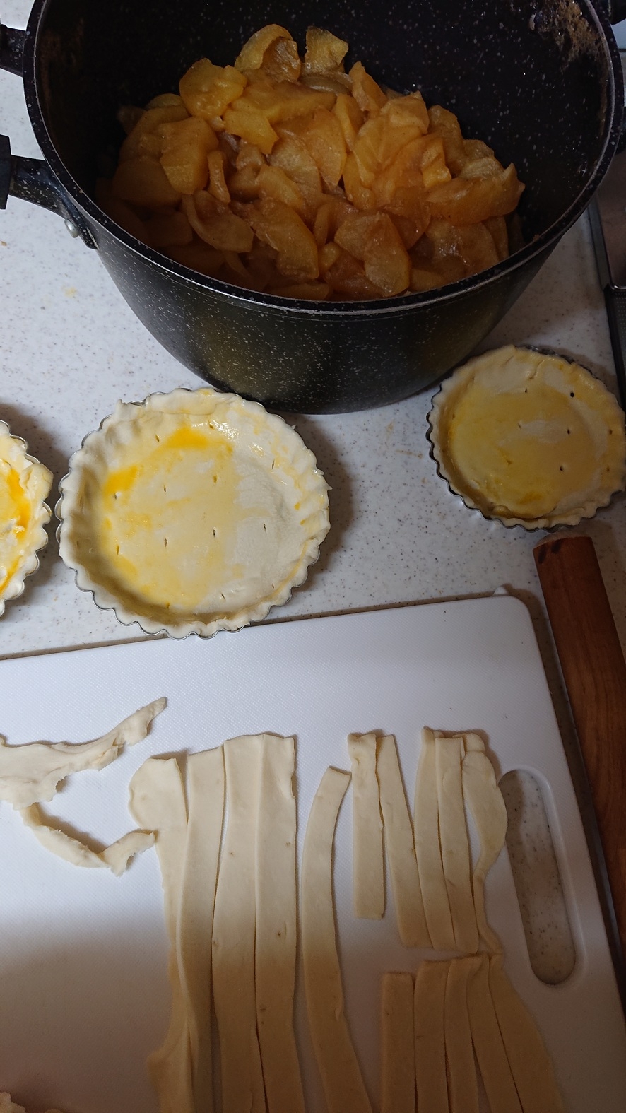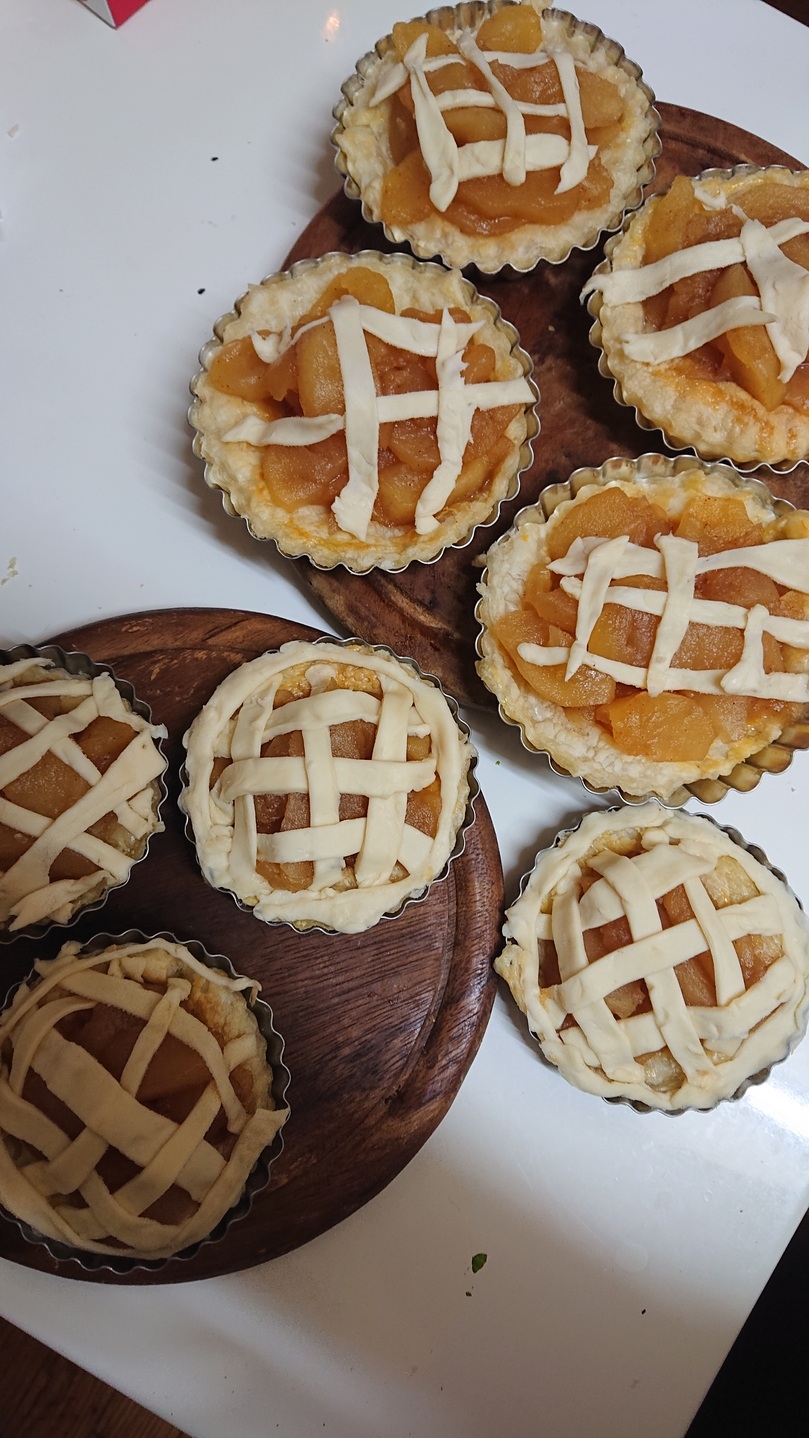 生地を貼り付けたら私は1度焼きます。その後りんごのコンポートを盛り付けて、上に網目状に蓋をします。