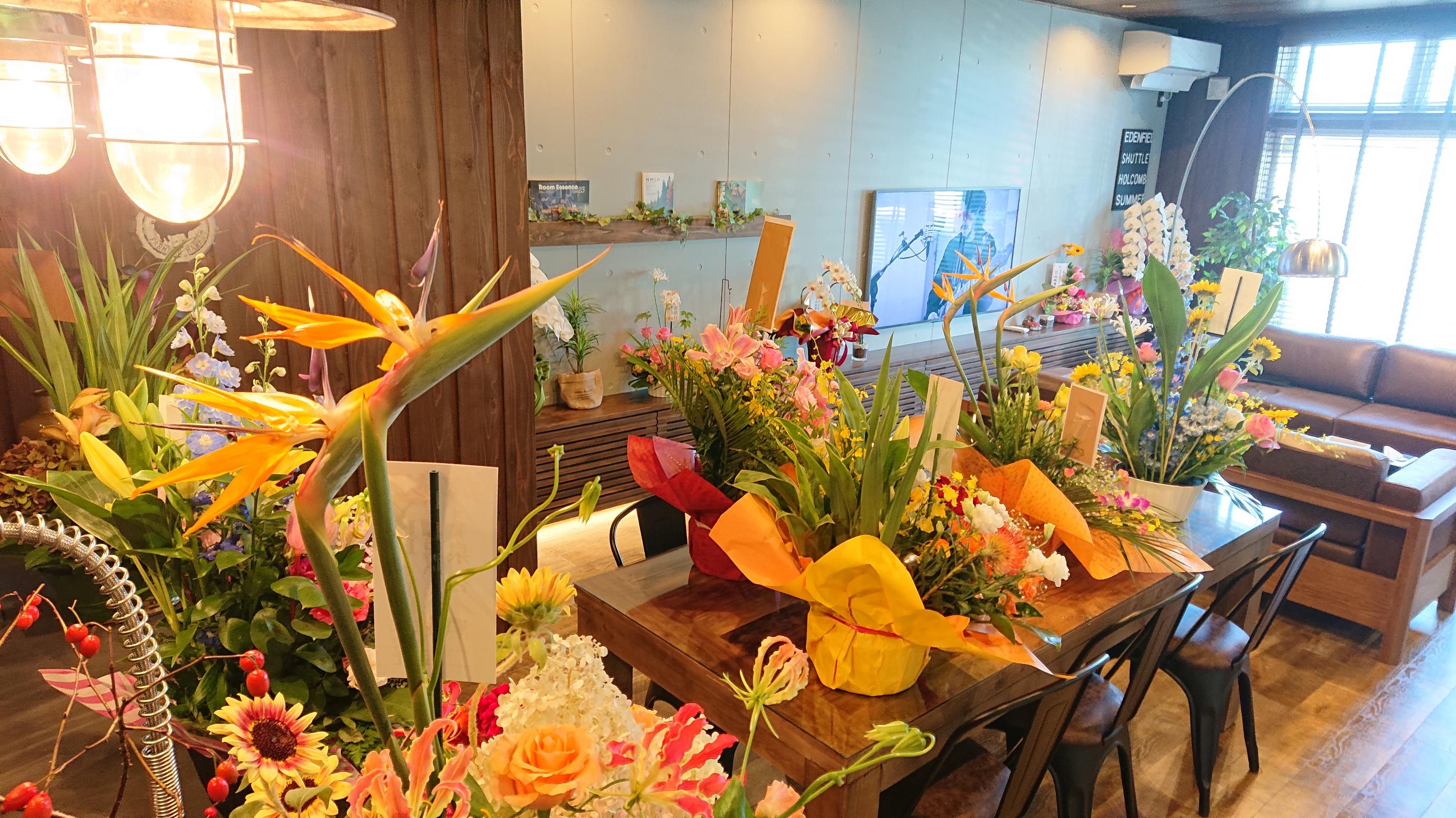ただいま事務所は皆さまから頂いたお祝いのお花とお菓子で華やかでございます。