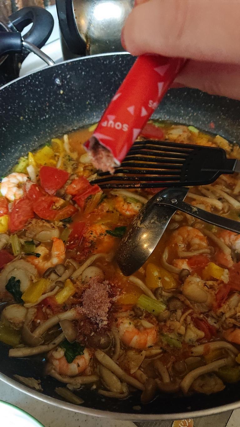 オリーブオイルでにんにくを炒めたら、シーフードや野菜を炒める!