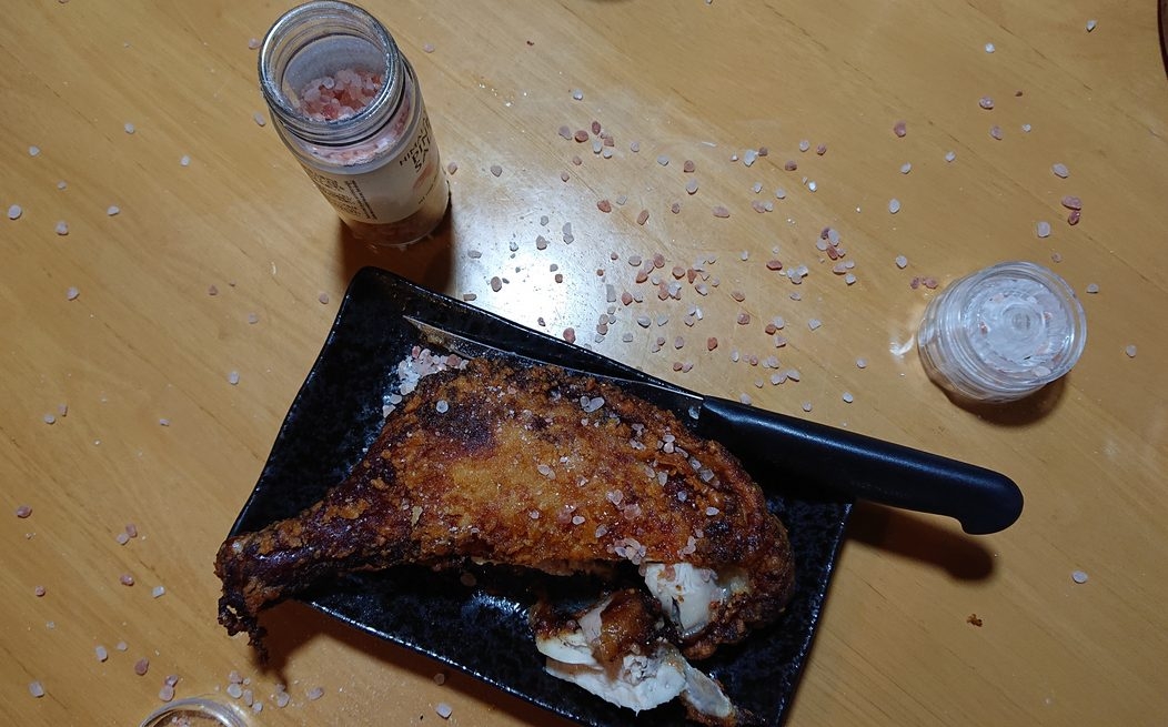 骨付き肉はね、しょっぱくなりましたよ。必要以上に。食感もバリバリしちゃって…。