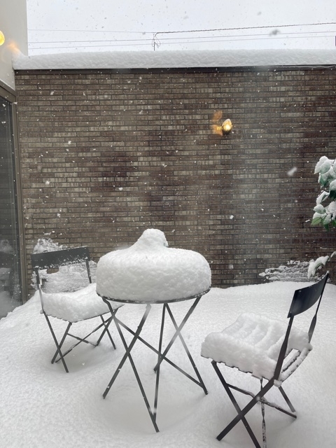 ウトナイモデルハウスのデッキにやっと出来ました。モンゴルの帽子マルガェに似たテーブルの雪山。