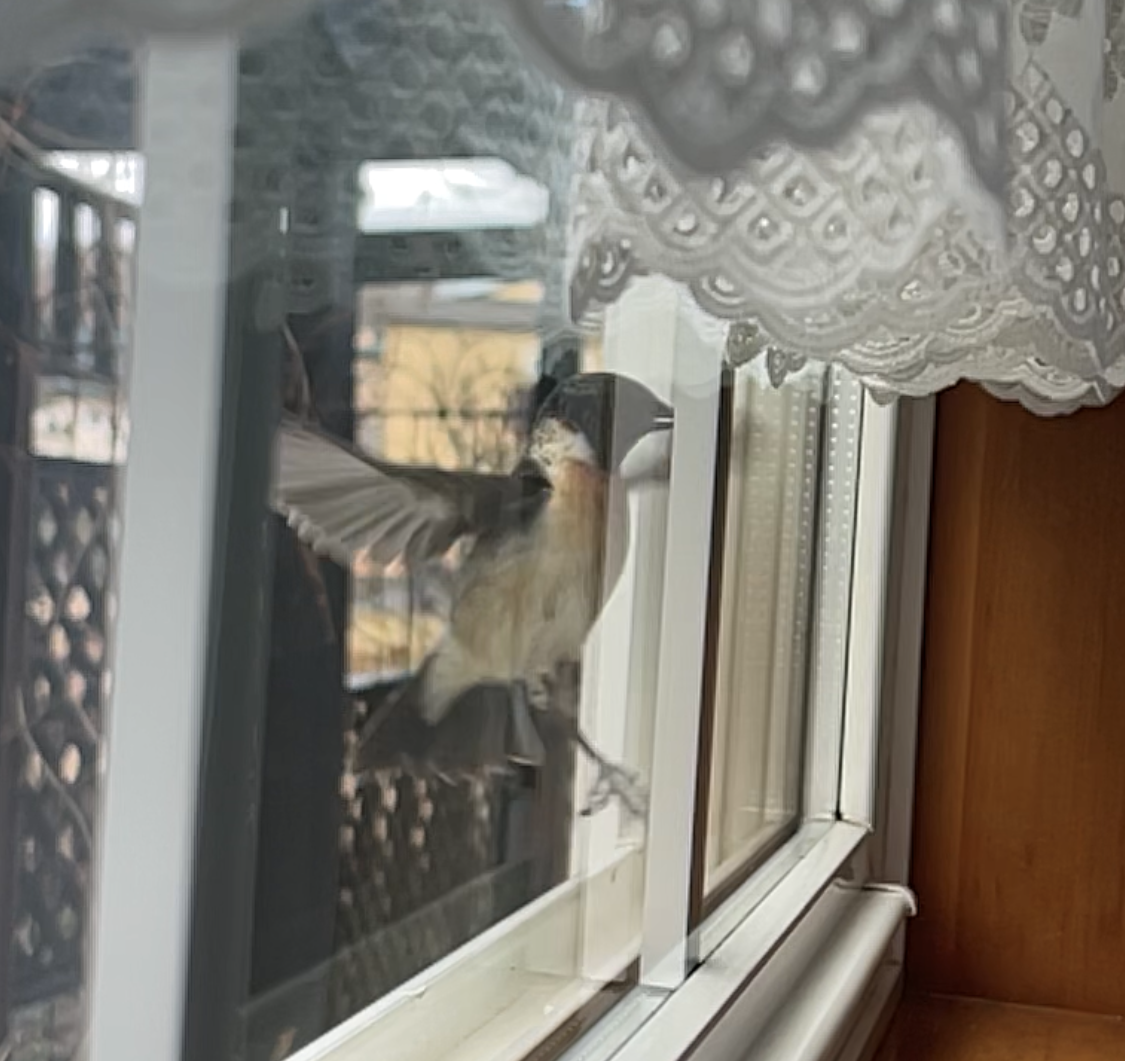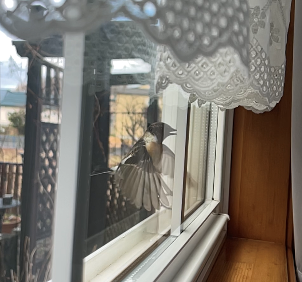 どうやら、春の求愛活動らしく、窓に映った自分を相手だと思っている。かもしれない。とのこと。