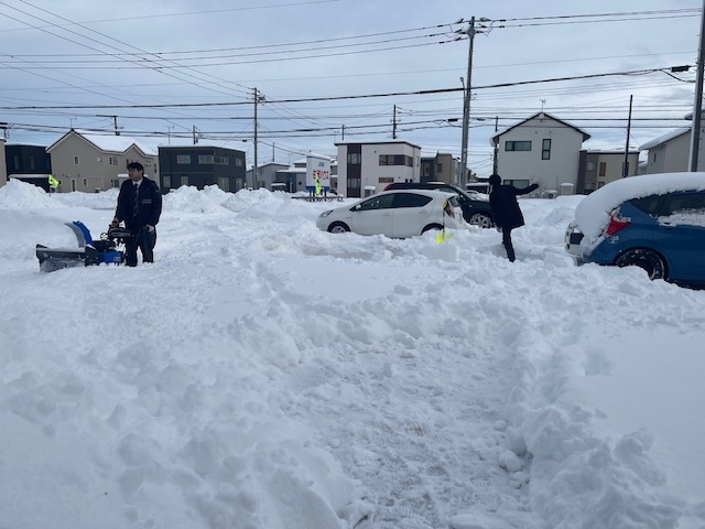 この後羽野君モデルハウスを除雪しに除雪機を押して歩いて行きました。