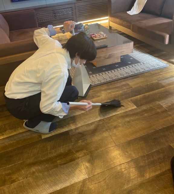 朝の事務所のお掃除中、羽野君がほうきを持ちながら、ジッーと床を見ているものだから、林:「何?何がある?どうした?何?」