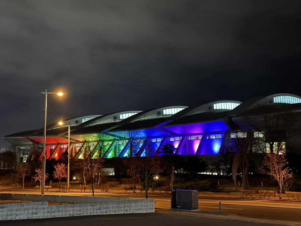 白鳥アリーナが虹色に光っていました。