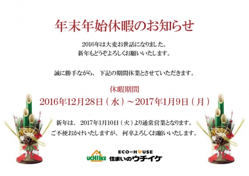 たくさんの応援ありがとうございました!! 2016.12.27 工藤 貴 明日より 年末年始休暇に 入ります。 2016年 お客様より たくさんの応援を頂き 素晴らしい年を 過ごすことが出来ました。 2017年!! 今年以上 更に もっと もっと たくさんの応援 よろしく お願いいたします。 休暇期間 苫小牧支店 ブログは 不定期に更新予定です。 ごめんなさい・・・。 2016年 住まいのウチイケ ホームページが リニューアル!! 素晴らしい事なのですが・・・ 個人的には ブログランキング消滅・・・ 内部ブログ構成により 説明が難しいのですが・・・ やはり 歳をとってくると 最新の考え方の理解度が・・・・ だめですねぇ~・・・ 2017年は 心機一転 楽しいブログにしていきたいと 思っています!! 乞うご期待!! 本当に 今年一年 ありがとうございました!! ‘感謝’ の言葉しか ありません。 それでは 良いお年を!! 苫小牧支店 工藤でした。 — — — — — — — — — — — — — — — — — — — — — — 室蘭、登別、伊達、苫小牧の新築・注文住宅は住まいのウチイケ。省エネルギー性能の優れた住宅を提供、リフォームも対応しています。モデルハウスも常時見学可能ですのでお気軽にどうぞ。 住まいのウチイケ https://uchiike.replantest.com 工藤 貴 左 苫小牧ブログ ブログ 右