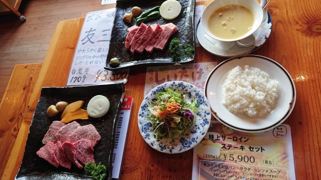 今週のランチ 2019.11.24 林 利都子 36号線上に看板があってずっと気になっていた苫小牧市美沢の「和牛レストラン ログハウス びび」行ってきました! 料理の下のメニュー表の品をそれぞれ頼みました! これ! 白老牛で、それはそれはおいしゅうございましたよ~。 メニュー表の金額を眺めながら有り難く頂きましたよ~。 〆のアイスも美味しかった! ご馳走様で~す!(๑´ڡ`๑) — — — — — — — — — — — — — — — — — — — — — — 室蘭、登別、伊達、苫小牧の新築・注文住宅は住まいのウチイケ。省エネルギー性能の優れた住宅を提供、リフォームも対応しています。モデルハウスも常時見学可能ですのでお気軽にどうぞ。 住まいのウチイケ https://uchiike.replantest.com 林 利都子 左 苫小牧ブログ ブログ 右