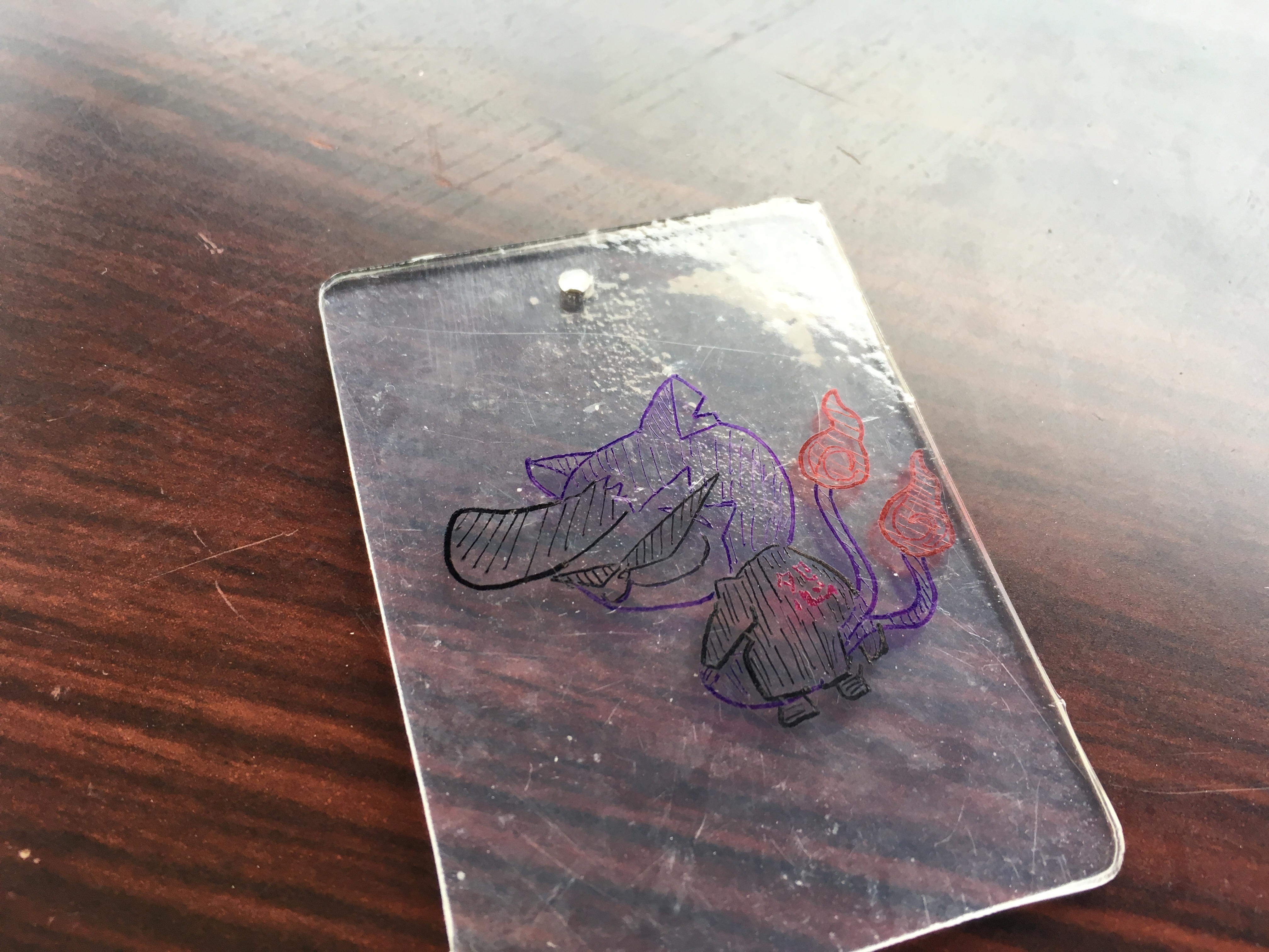 下の写真は大きめのプラスチックの板に絵を描いてもらって熱を入れると縮んでカチカチに!