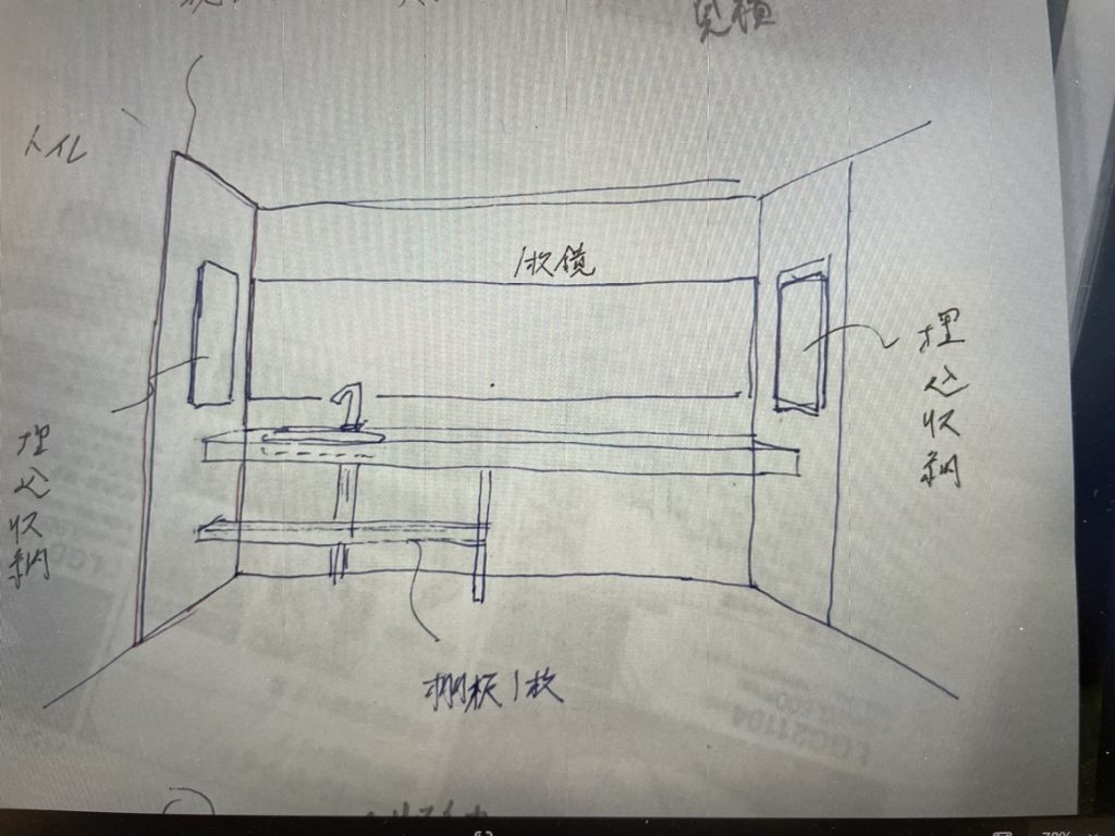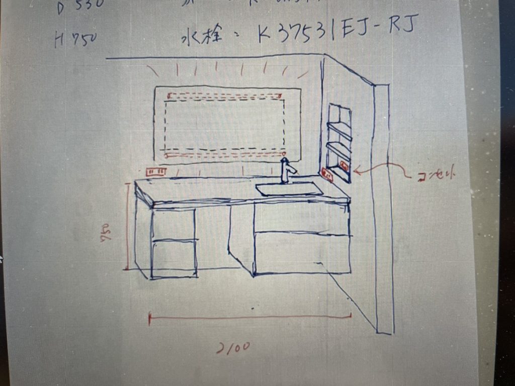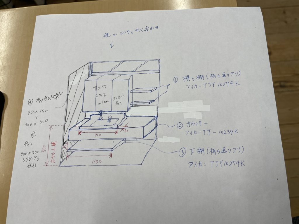 最近、絵にかいてイメージを共有することが増えました。ちょっと流行りで洗面化粧台を造作するケースがあります。過去の造ったものやインスタ、ルームクリップで画像で確認することもありますが、パッと描いてしまった方が早いことがあります。