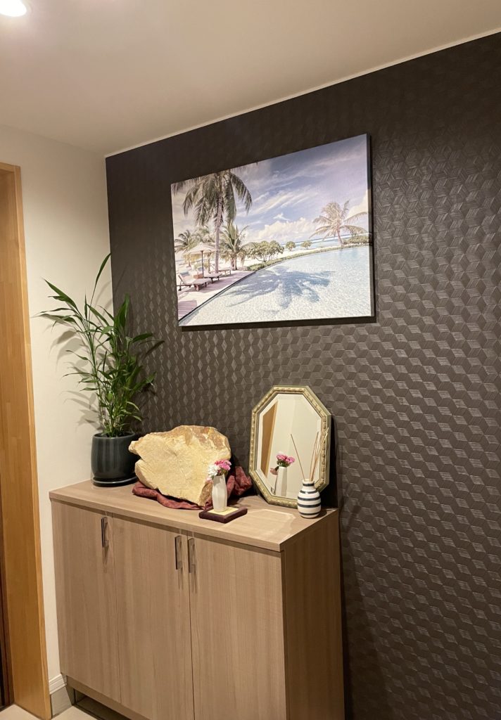 というのも、漠然と下駄箱には飾りや花でもあしらって、壁には絵画や写真など何かしらを掛けようと思っていました。しかしながら、何を掛けようか・・・ ダラダラと決まらないまま時は経ちました。しかもその壁は飾りが目立つように黒にしておいたのです。