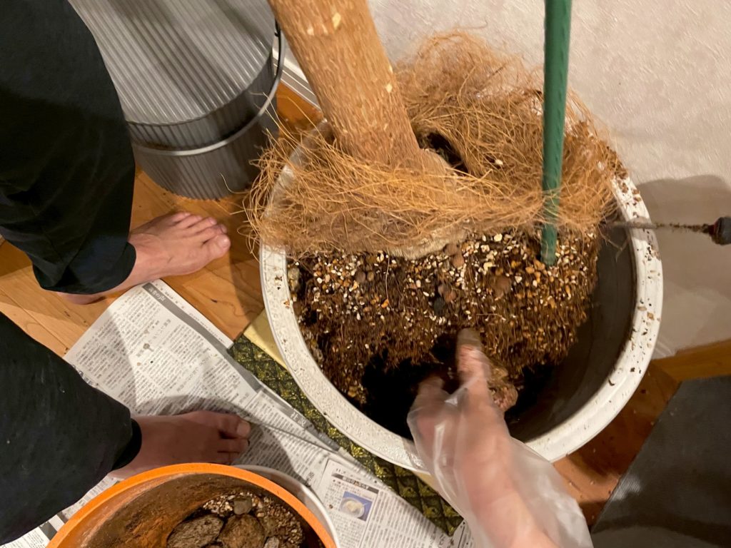 巨体を持ち上げ、根っこのカラミをほぐしつつ、土はガンガンこぼれまくり・・・