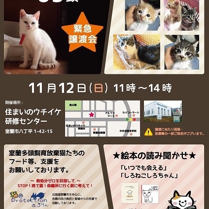 猫の譲渡会だな。 2017.11.05 大島 剛 大島です。 11月12日は当社住まいのウチイケ研修センターにて 猫ボラです。 最近新聞やテレビで話題の多頭飼育放棄の猫さん達です。 色々な事情があるのかも知れませんがひどすぎですって!! 次回のポスターです。 前回同様、たくさんの里親になる方が来てくれれば良いですね。 お時間がある方は是非来てください。 お待ちしてます。。 それではバイなら~!!! — — — — — — — — — — — — — — — — — — — — — — 室蘭、登別、伊達、苫小牧の新築・注文住宅は住まいのウチイケ。省エネルギー性能の優れた住宅を提供、リフォームも対応しています。モデルハウスも常時見学可能ですのでお気軽にどうぞ。 住まいのウチイケ https://uchiike.replantest.com 大島 剛 左 室蘭ブログ お知らせ 右