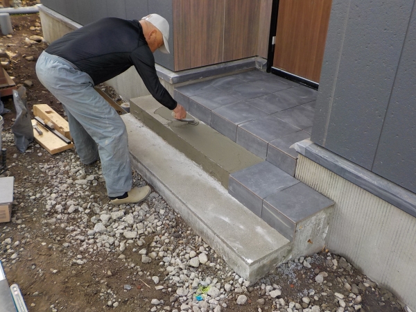 玄関タイルを貼っています。