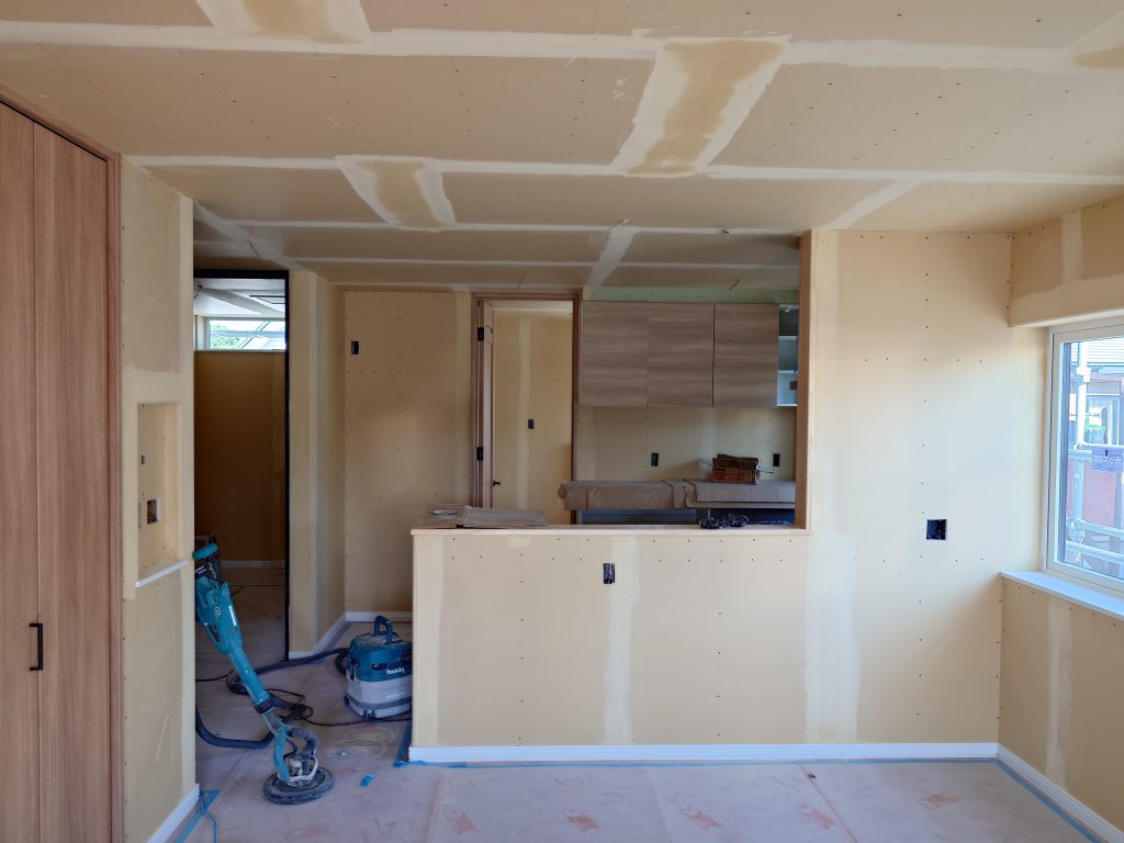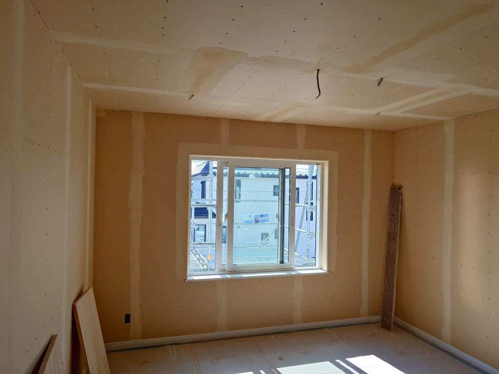 石膏ボードの継ぎ目にパテを埋め平滑にしてから、クロスを貼り、内装の壁を仕上げていきます。