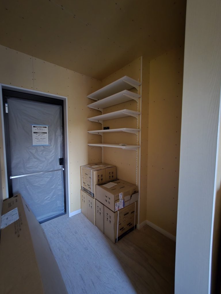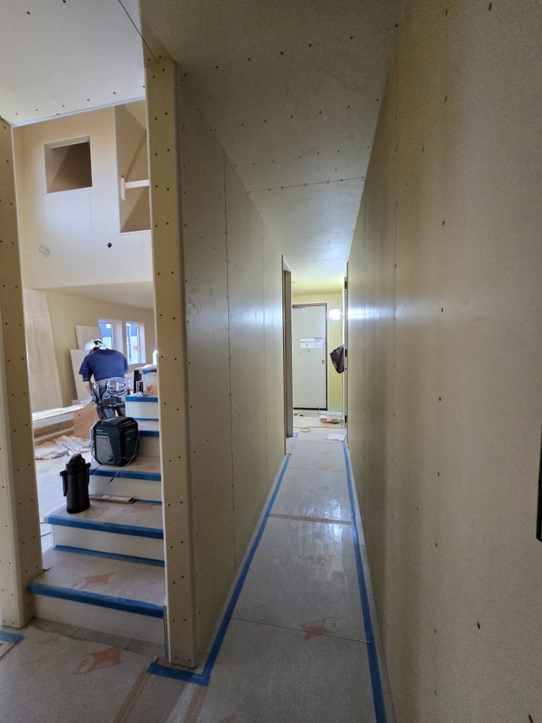 外壁が張りあがりました。内部ではクロス工事が進行中です。