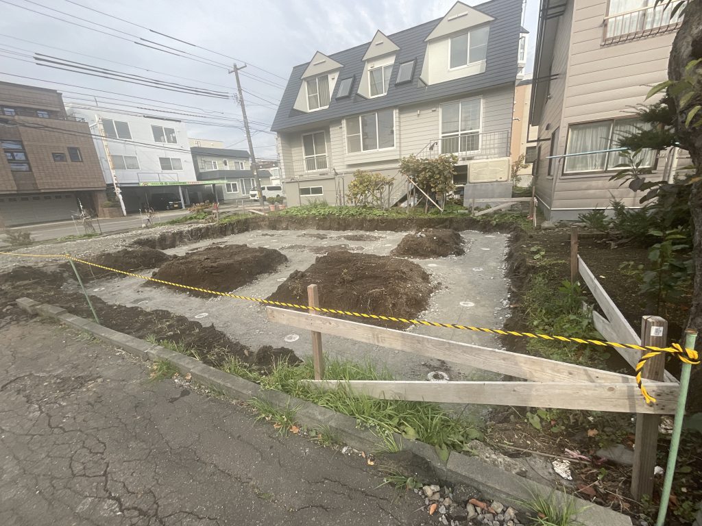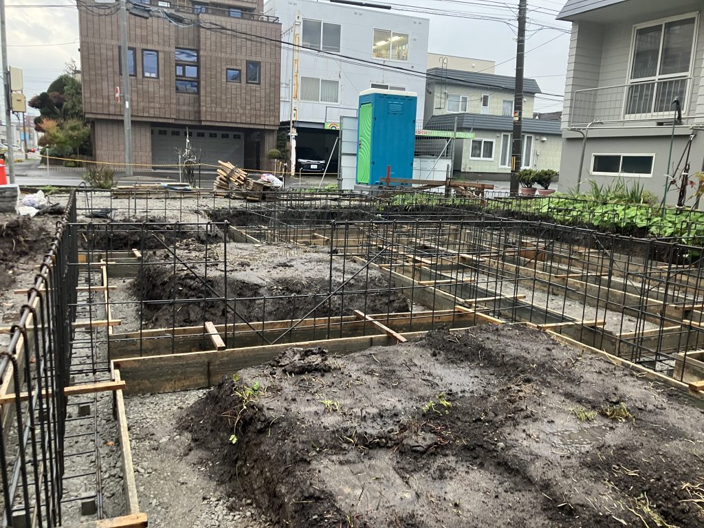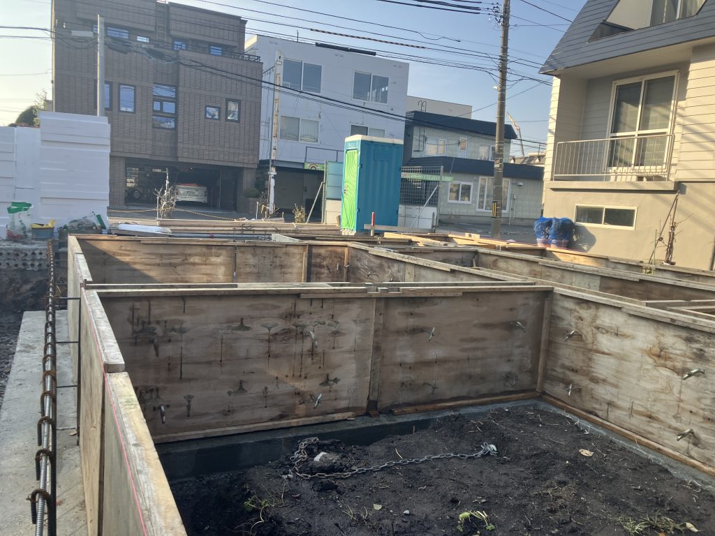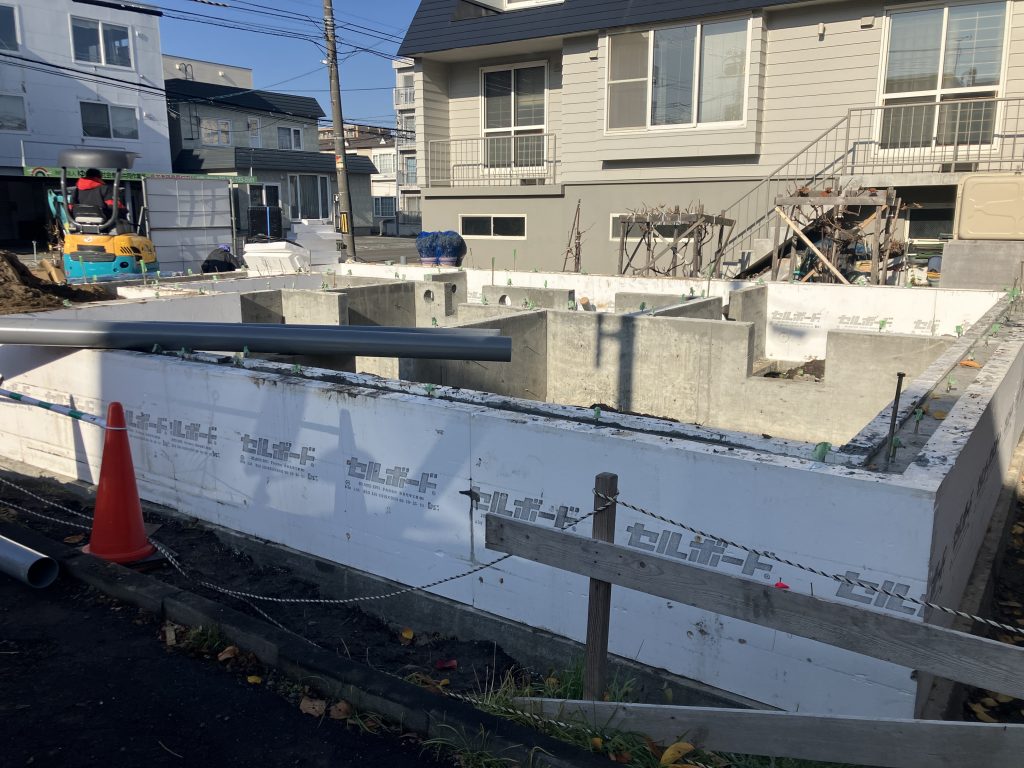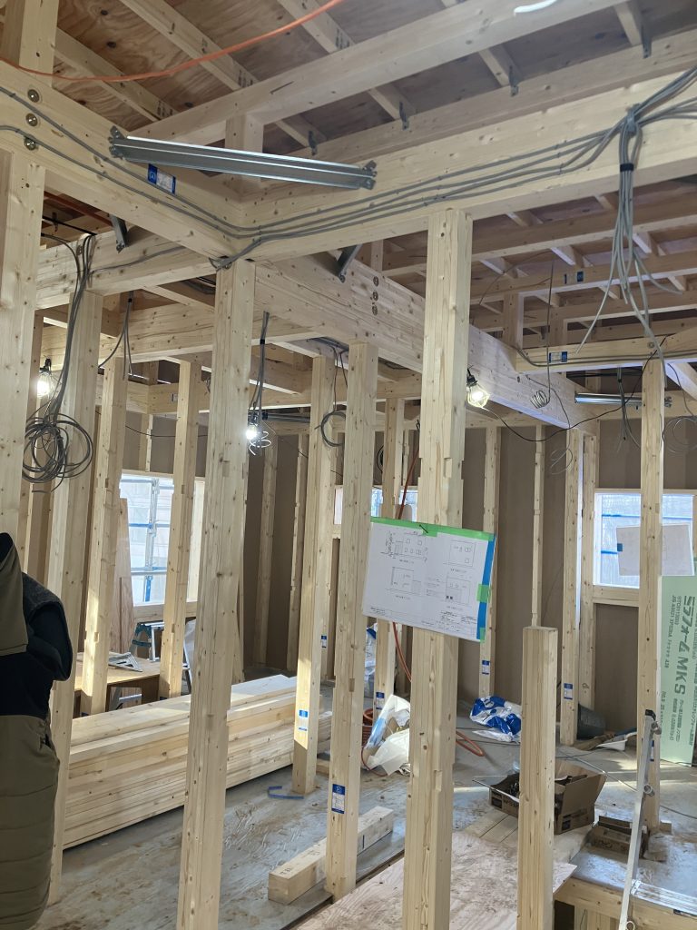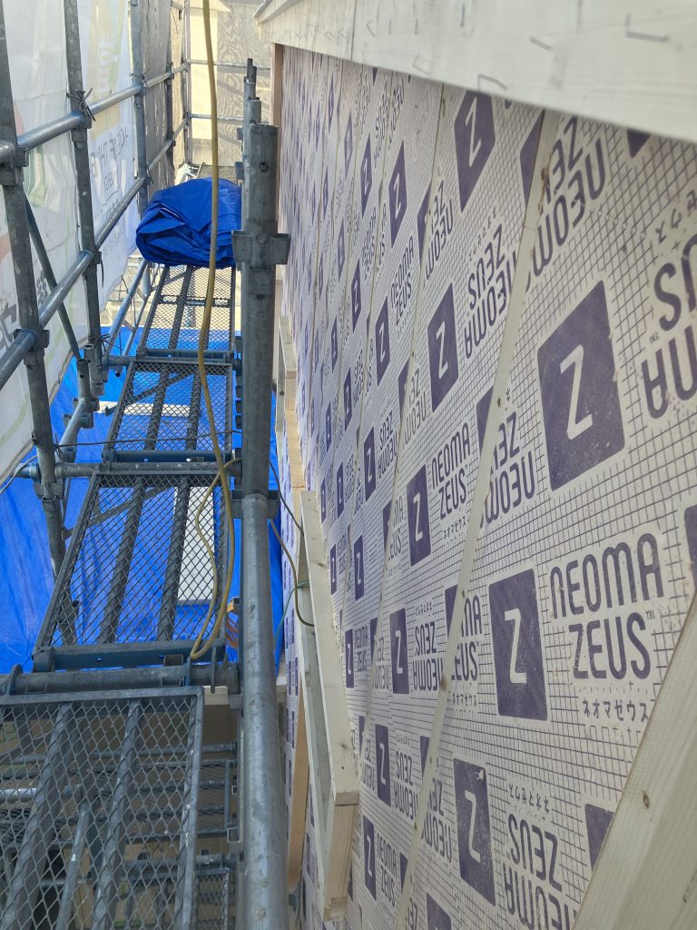 壁内断熱ブローイング工事完了し、ポリフィルムを施工しております。