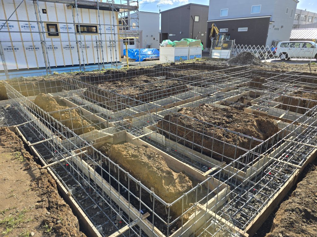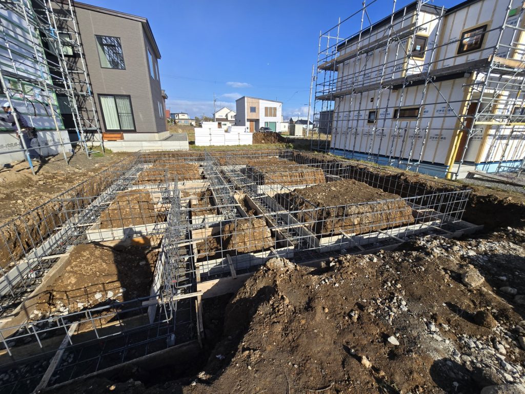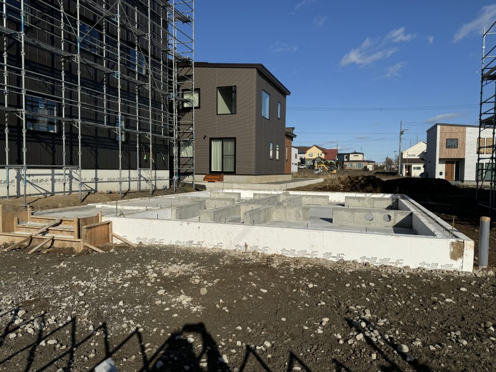 基礎工事が完了し、養生期間を設け基礎の強度を出します。お施主様との完成立合いを行い、土台据え→建て方(上棟)に進んでいきます。