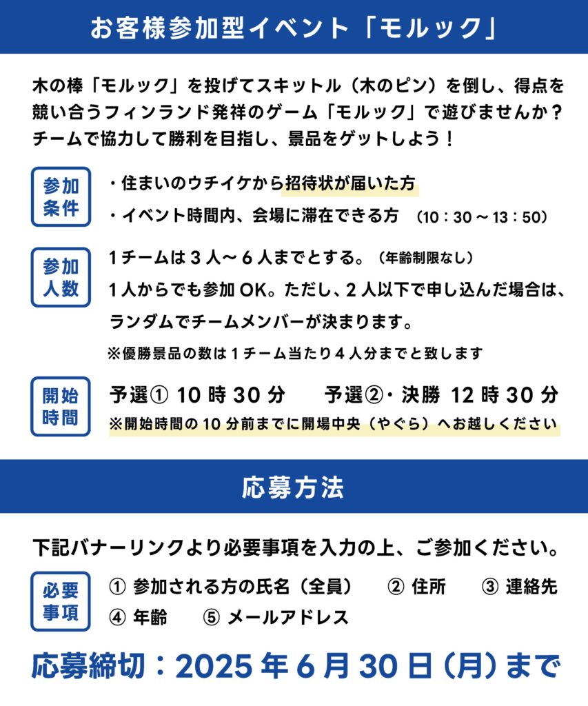 夏と言えば感謝祭!第22回住まいのウチイケ感謝祭を開催します。スタッフが作る屋台やこども縁日、人気のキッチンカーが大集合!こどもからおとなまで楽しめる参加型イベント「モルック」も企画しております。住まいのウチイケスタッフVSお客様!勝利チームには豪華景品もご用意しておりますので家族みんなでお気軽にご参加ください。