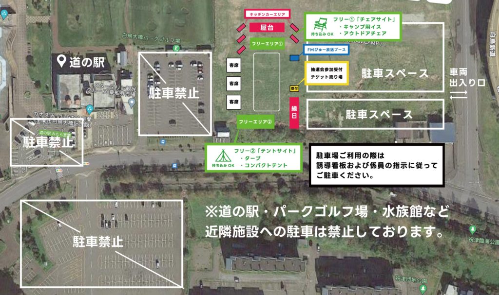 会場内に駐車場を設けております。スタッフの指示に従ってご駐車ください。道の駅、パークゴルフ場、水族館など近隣施設への駐車を禁止しておりますので、ご協力よろしくお願いいたします。