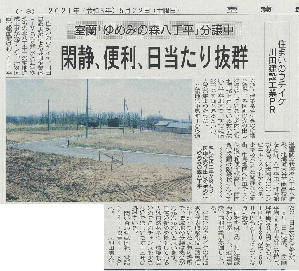 室蘭民報:「ゆめみの森八丁平」24区画 販売開始