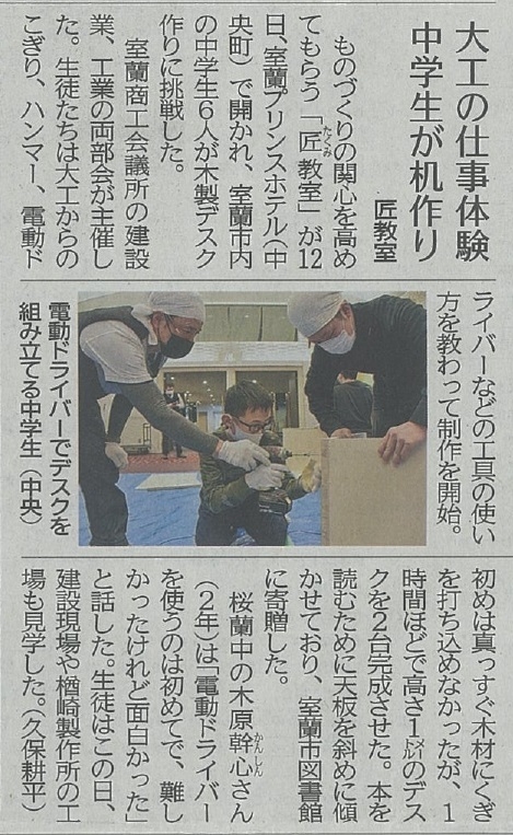 北海道新聞:ものづくり匠教室で住まいのウチイケ大工が指導役に