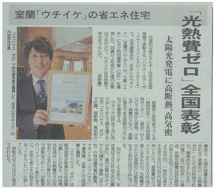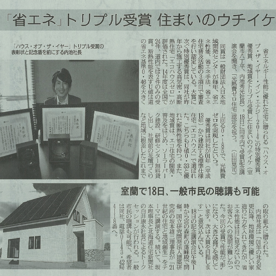 北海道新聞:ハウスオブザイヤーインエナジー2014 三部門受賞