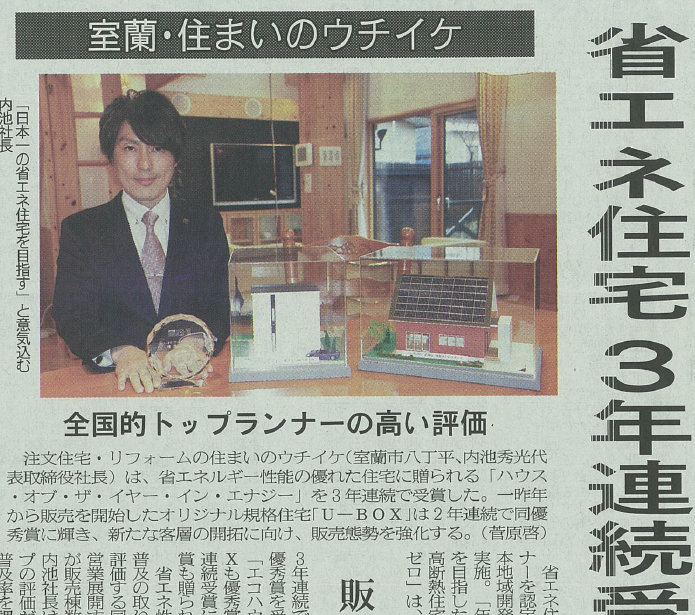 室蘭民報:ハウスオブザイヤーインエナジー3年連続受賞
