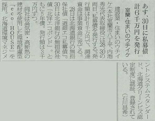 室蘭民報:計6,000万円の無担保社債を発行